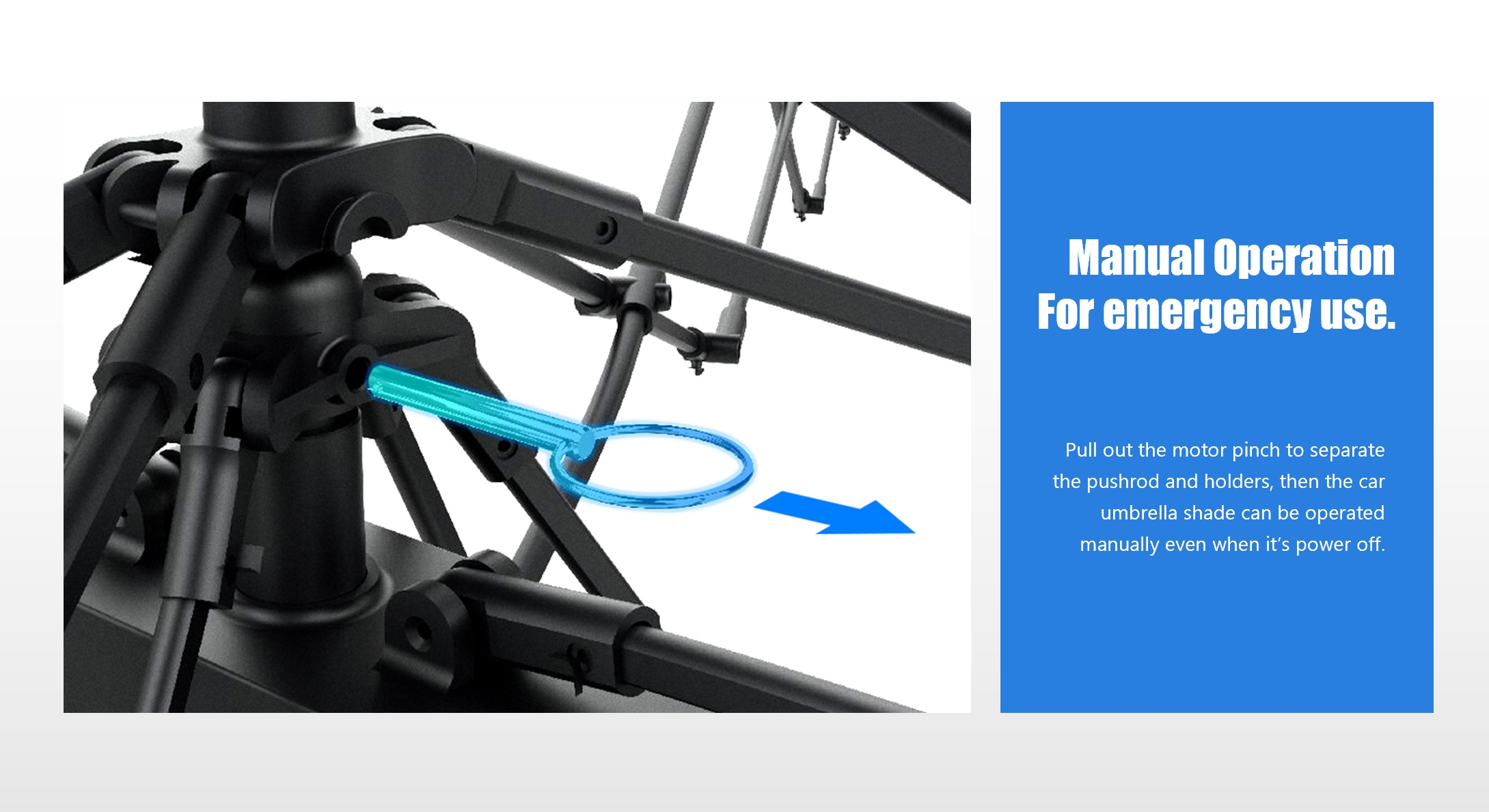 In addition to automatic raising and lowering via remote control, it can also be switched to manual mode at any time to suit different preferences. The optimized motor consumes less energy and is more battery-friendly. The specially designed outdoor tripod structure ensures a more stable installation and allows for quick setup outside the vehicle, facilitating the creation of a temporary sunshade for camping trips.