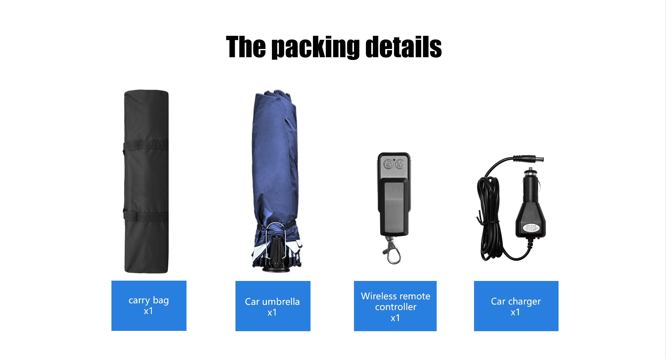 Portable Car Umbrella x 1, Storage bag with zipper x1, User manual and warranty card x1 . |